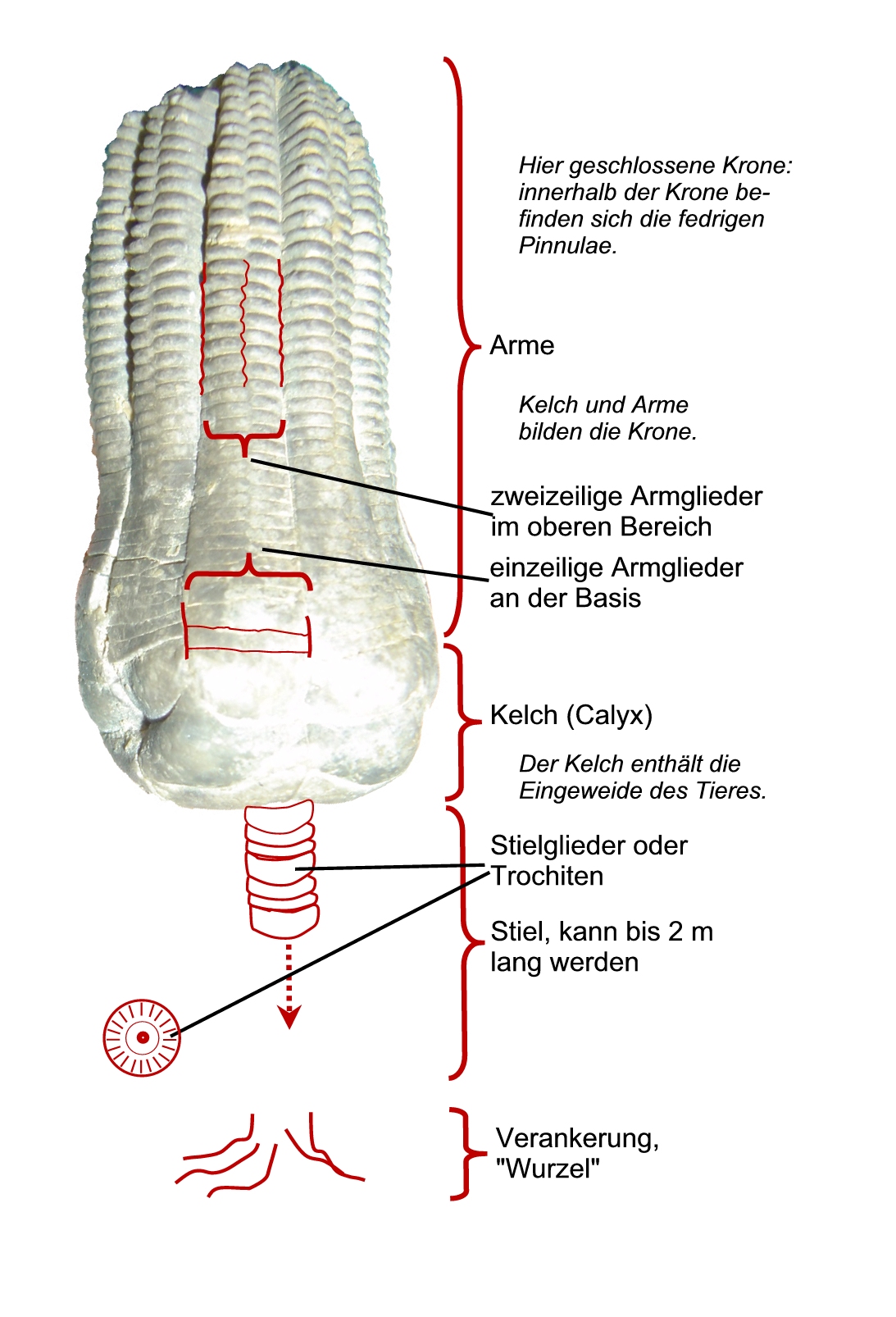 In der Strömung richtete sich das bis zu 150 cm hohe Tier auf. Mit den Fliederärmchen in der Krone filterte es fressbare Partikel aus der Strömung.